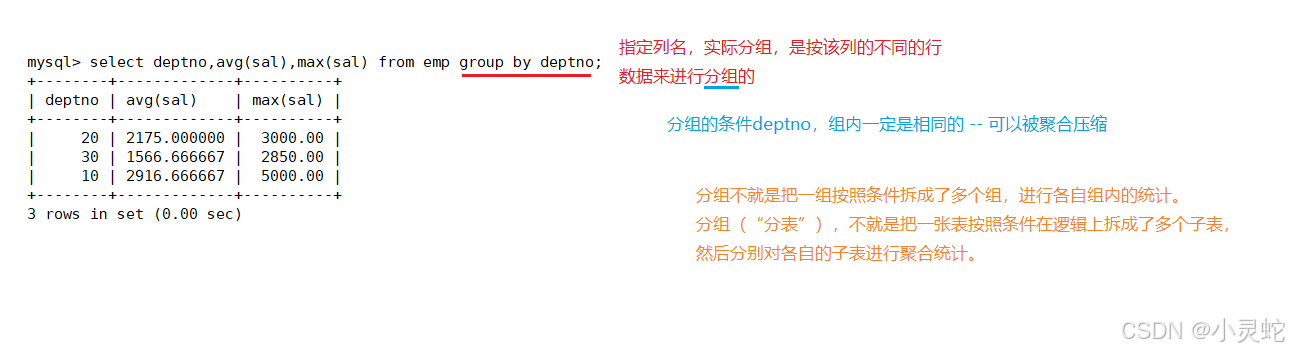 select column1, column2, .. from table group by column; 分组的目的是为了进行分组之后,方便进行聚合统计。