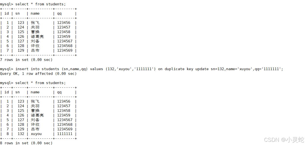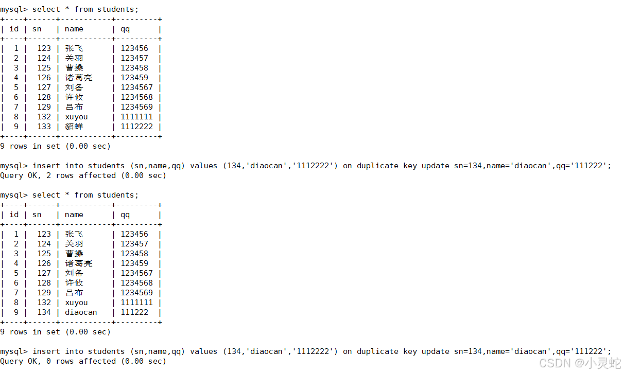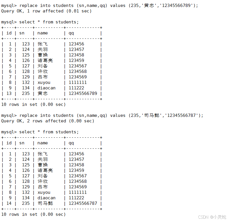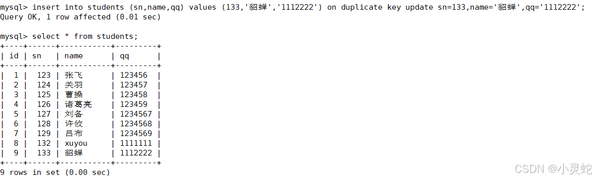 REPLACE INTO students (sn, name) VALUES (20001, '曹阿瞒');