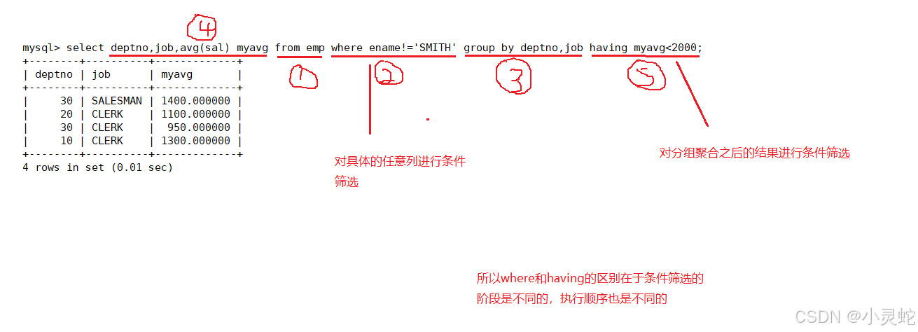 having经常和group by搭配使用,作用是对分组进行筛选,作用有些像where。