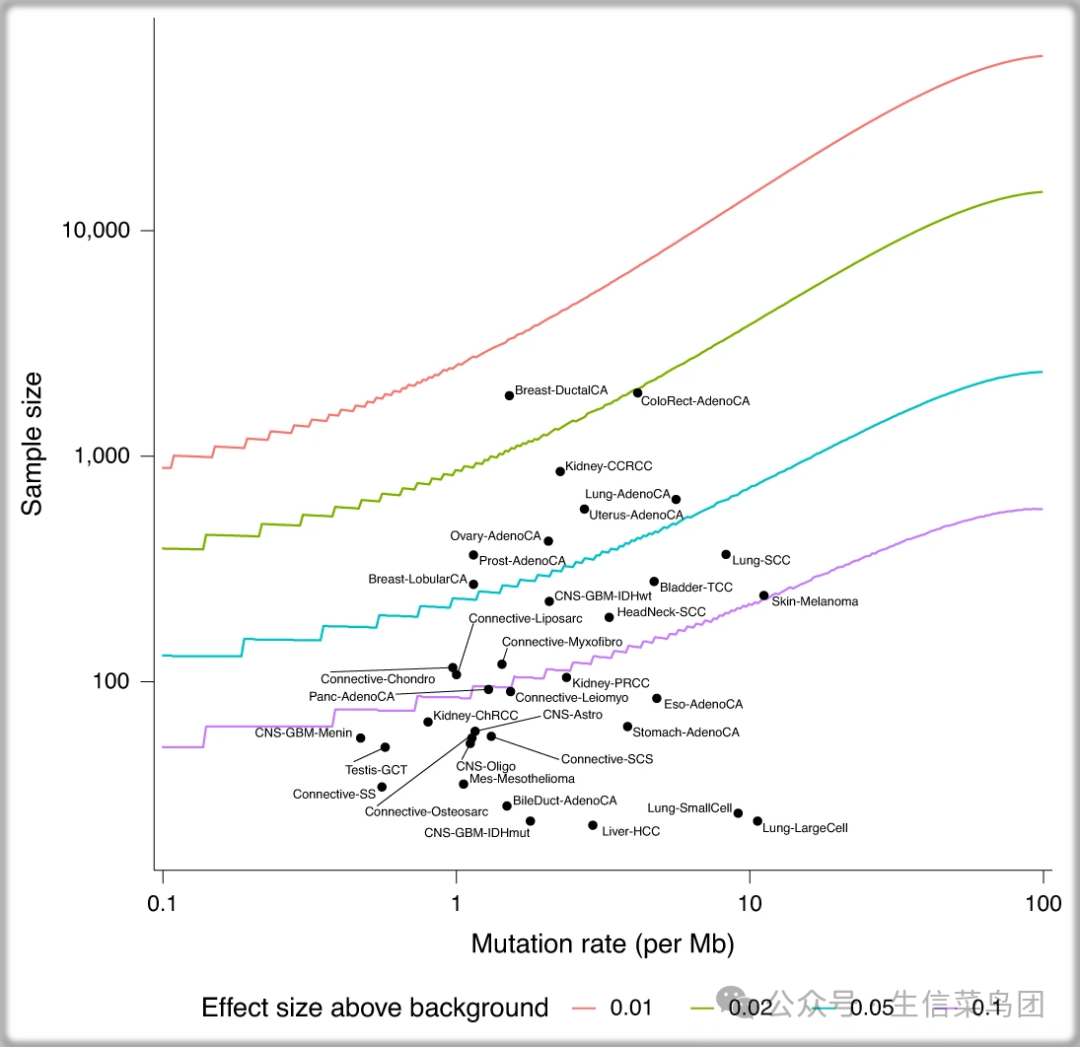 Fig. 2: Power estimates for driver gene identification per tumor type.