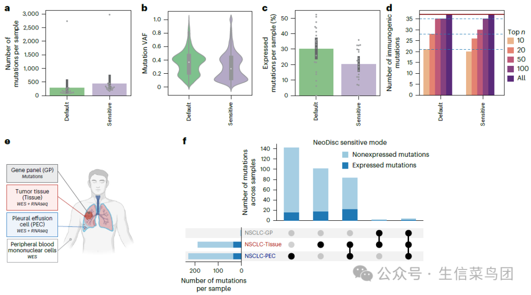 个性化疫苗设计: NeoDisc提供了两种额外模式,以应对低肿瘤含量和低突变负担的活检样本,从而优化疫苗设计。(1) “sensitive”模式,该模式使用四种突变调用工具的并集, (2) “panel”模式,主要是使用临床 Gene panel 中列出的突变, 这可以为缺乏专门活检的人设计疫苗,因为Gene panel 提供的突变数量不足,导致新抗原列表不理想或可能根本没有。与默认模式相比,“sensitive”模式变异等位基因频率 (VAF) 和支持突变的 RNAseq 读数分数均有所下降,表明已鉴定变异的特异性降低(图3abc)。在NSCLC-1数据集中比较三种模式,发现 NeoDisc 中的三种模式允许分析各种样本来源,确保有效识别表达的突变(图3def)。