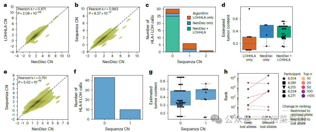 HLA LOH分析:HLA LOH 会导致所呈抗原的多样性降低,NeoDisc 将样本特异性 HLA 分型与 HLA CN 信息相结合。使用 Sequenza 来估计肿瘤含量和 CNV,并使用 HLA-HD 来估计种系和肿瘤 WES 和 RNAseq 的 HLA 分型。在NCI数据集中,NeoDisc 的 HLA CN 估计与 LOHHLA 和Sequenza的结果非常相似 (图4)