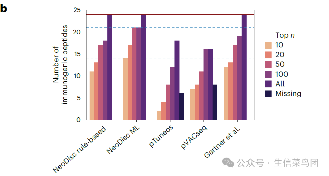 NeoDisc的性能: NeoDisc 的rule-based 算法、ML 算法、pTuneos 、 pVACseq 、以及 Gartner 等人报告的方法相比,NeoDisc 在准确优先级排序免疫原性新抗原方面优于现有的工具。