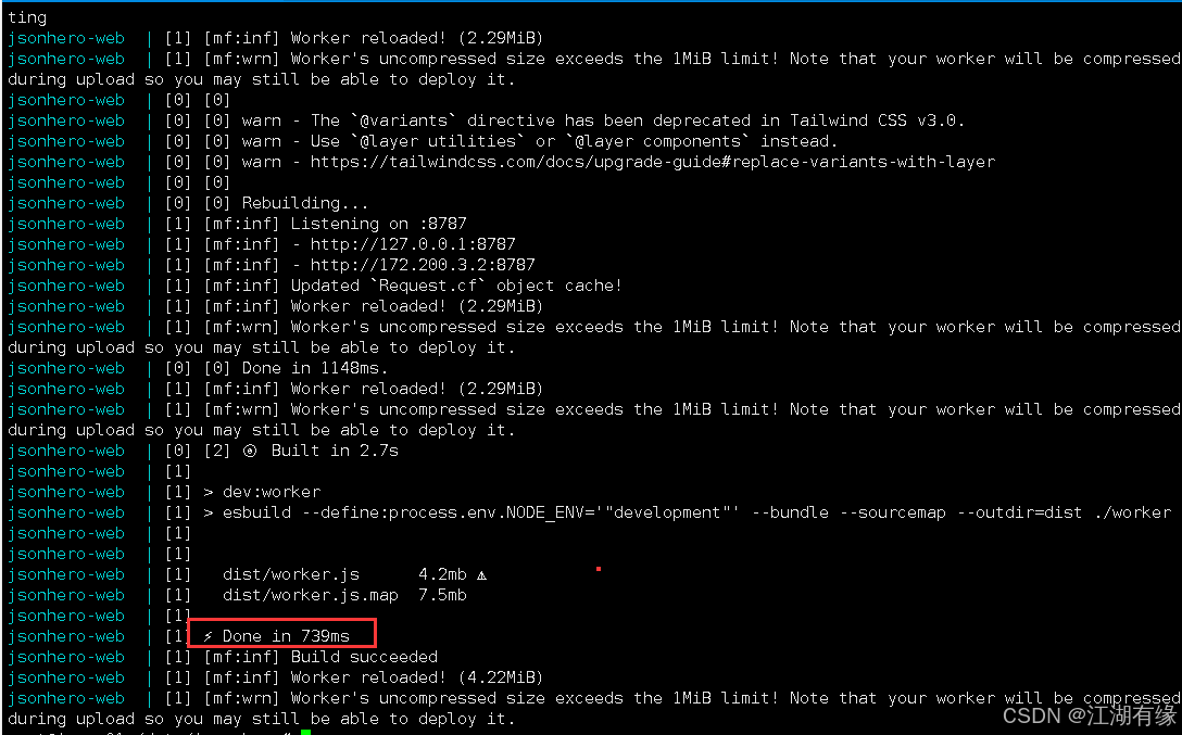jsonhero-web henryclw/jsonhero-web:latest "npm start" jsonhero-web 4 minutes ago Up 4 minutes 0.0.0.0:9500->8787/tcp, :::9500->8787/tcp检查JSON Hero容器日志,确保JSON Hero服务正常运行。