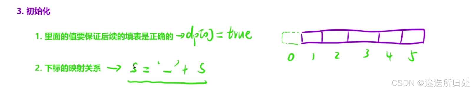 3. 初始化 :把dp表填满不越界,让后面的填表可以顺利进行 这里我们需要 加上一个虚拟节点,因为如果是整个字符串构成最后一个单词的情况的话,那么j - 1 就会越界 教给大家一个关于字符串类型题目的下标映射解决方法,我们可以在原字符串前面加上一个新的字符(随便什么,一般是空格),然后再赋值给字符串,这个时候就相当于原字符串是从1开始计数,就不用再统一往后移一位了