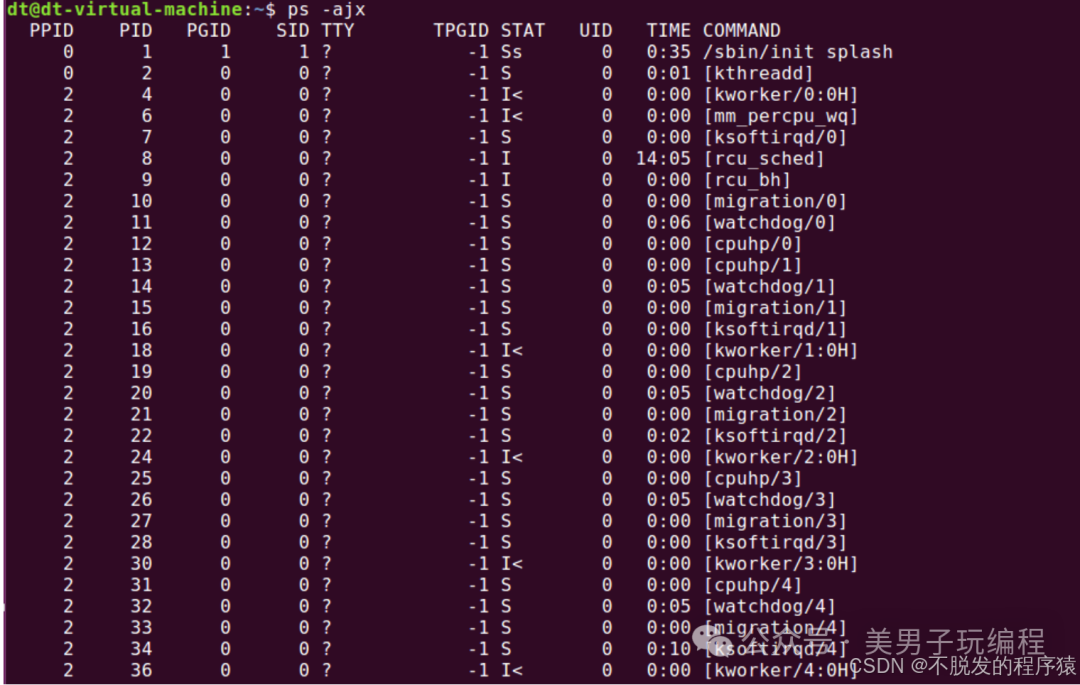 在命令输出中,如果 TTY 一栏显示为问号(?),这表示该进程没有控制终端,通常意味着它是一个守护进程。同时,COMMAND 一栏中用中括号([])括起来的进程表示内核线程。