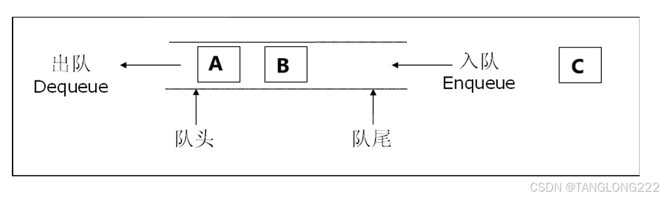 队列的数据从队尾插入,从队头删除,根据上图的示意,我们就可以发现,A先进入队列,B后进入队列,那么在出队的时候,就还是A先出,B后出,所以队列确实满足先进先出,后进后出的特性