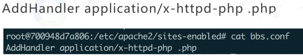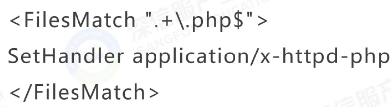 它的作用也是为了让apache把php文件交给php_module解析,但是注意到它与SetHandler:它的后缀不是用正则去匹配的。所以,在文件名的任何位置匹配到php后缀,它都会让php_module解析。