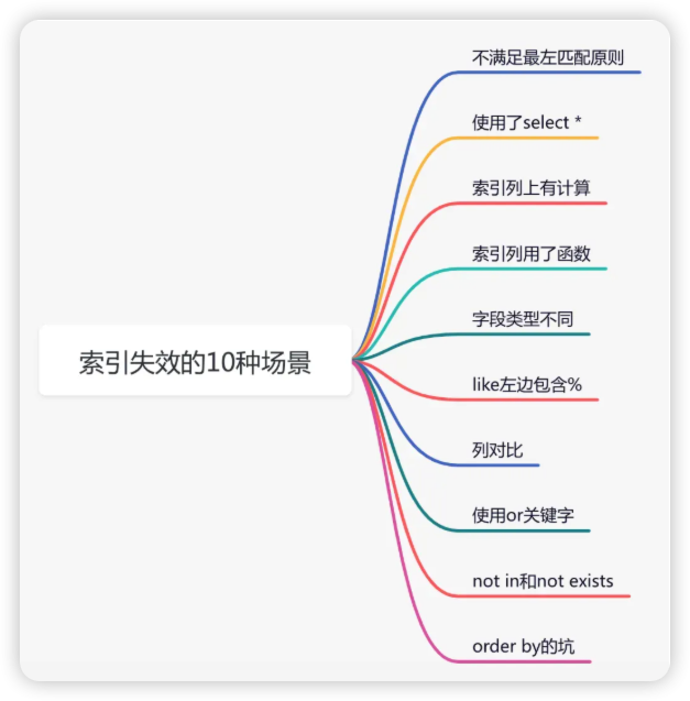 想进一步了解索引失效问题的小伙伴,可以看一下我的另一篇文章《聊聊索引失效的10种场景,太坑了》,里面有非常详细的介绍。