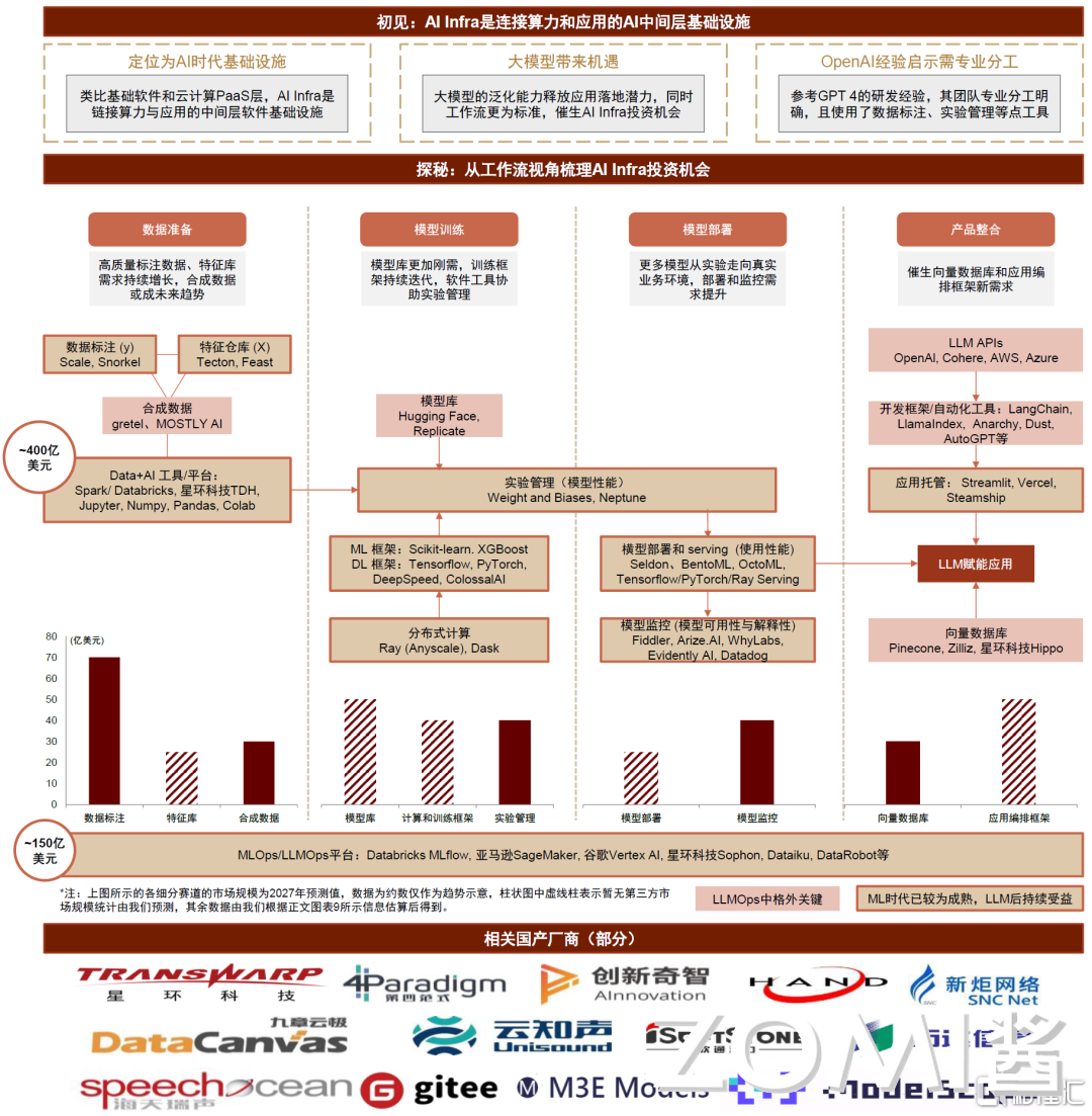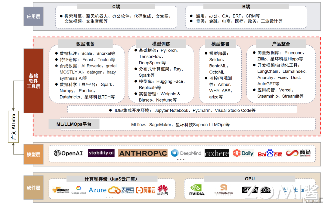 • AI Infra(AI 基础设施)是连接 AI 训练推理全流程的软件应用,及 AI 中间件基础设施。主要包含大模型从设计、生产到应用等全流程所配套的横向软硬件设施。