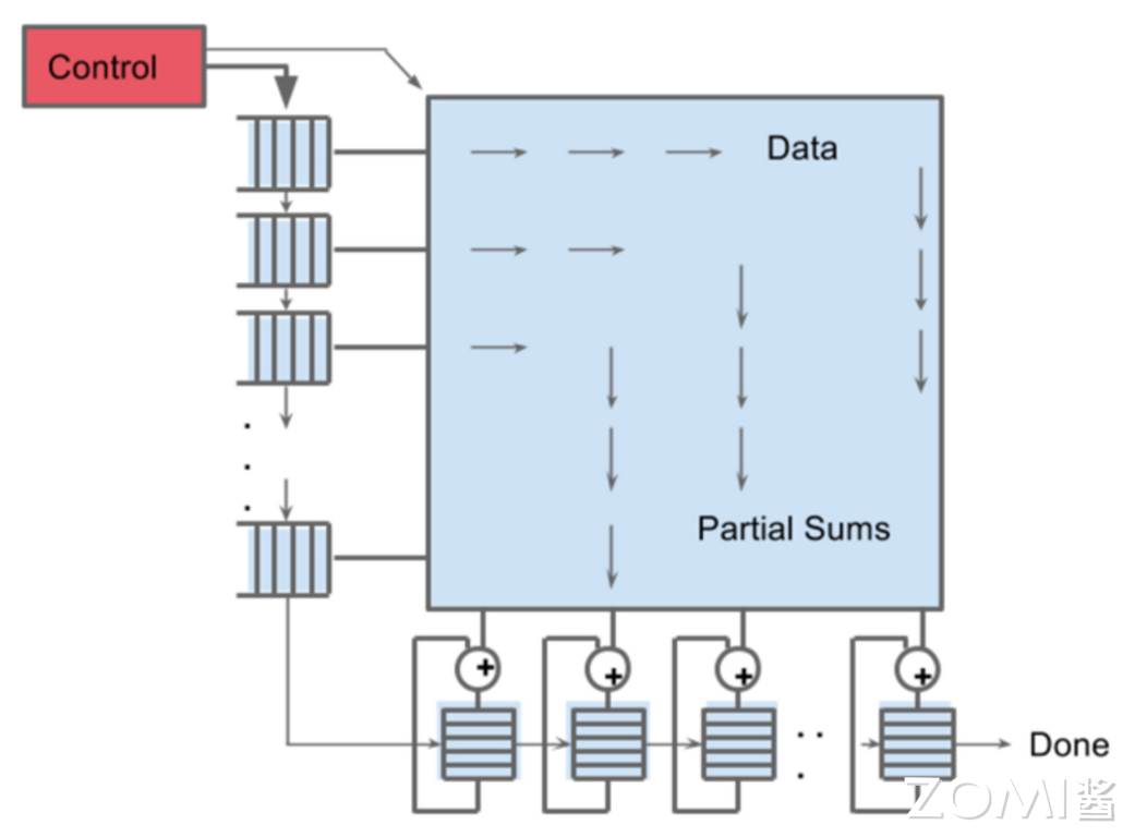 MXU 的本质就是一个包含了 256 \times 256 = 65536 个 ALU 的超大的、每一个时钟周期可以处理 65536 个 INT8 加乘运算的脉动阵列。将这个数字和 TPU v1 的频率 700MHZ 相乘我们可以得出 TPU v1 可以每秒钟处理 65536 \times 7 \times 10^8 \approx 4.6 \times 10^{12} 个加乘运算。下图中我们可以看到,数据和权重由控制器控制传入 MXU,脉冲阵列中经过计算再产出最终的结果。