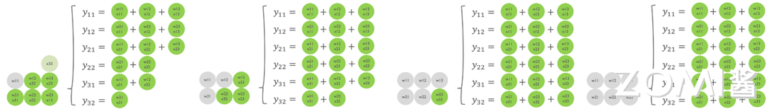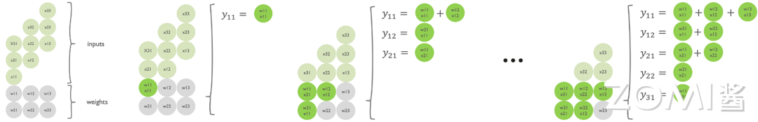 用脉动阵列做输入矩阵和权重矩阵的矩阵乘法示意图: