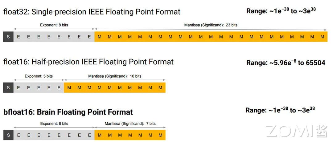 下图中详细解释了 FP32,FP16 和 BF16 的区别。总的来说,BF16 数据格式通过减少尾数位数至 7 位,同时保留 8 位的指数部分,用一定的数据精度换来了更宽的数值范围。这种优化主要带来了以下三个优势: