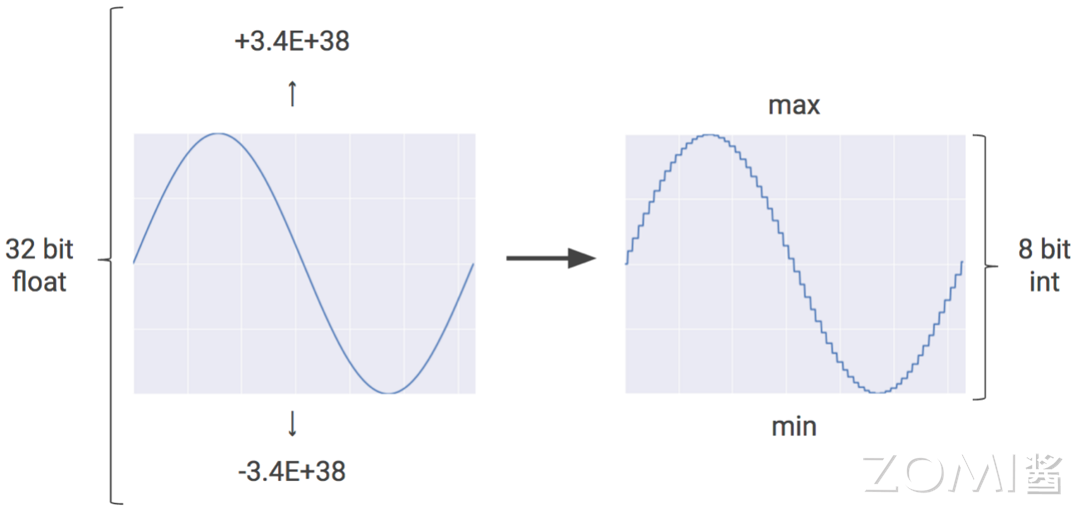 神经网络在进行推理时,并不总是需要 32 位浮点数(FP32)或 16 位浮点数(FP16)以上的计算精度。TPU 通过引入一种称为量化的技术,可以将神经网络模型的权重和激活值从 FP32 或 FP16 转换为 8 位整数(Int8),从而实现模型的压缩。这种转换使得 INT8 能够近似表示在预设最小值和最大值之间的任意数的同时优化模型的存储和计算效率。