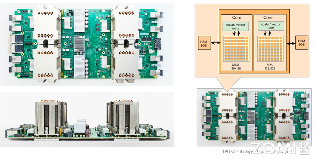 TPUv2 | 2017 年 | 180TFlops(浮点计算能力) + 64GB(HBM) | 数据中心训练和推理 |