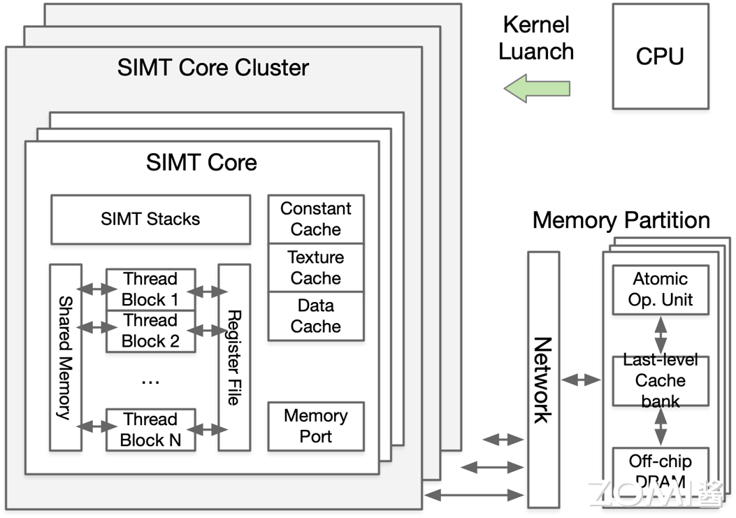 具体到 SIMT 的硬件结构,SIMT 提供一个多核系统(SIMT Core Cluster),CPU 负责将算子( Kernel)加载到 SIMT Core Cluster 中,每个 SIMT 核(SIMT Core)有独立的 RF(Register File)、ALU、Data Cache,但是只有一个指令计数寄存器(Program Counter)和一个指令译码寄存器,指令被同时广播给所有的 SIMT 核,从而执行具体的计算。GPU 则是由多个 SIMT Core Cluster 组成,每个 SIMT Core Cluster 由多个 SIMT Core 构成,SIMT Core 中有多个 Thread Block。