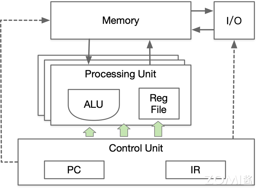 为了使 SIMD 实现一次乘法可以完成多个元素的计算,要求硬件上增加 ALU 单元的数量,因此会有多个处理单元(Process Unit),同时也需要增加功能单元的数据通路数量,由控制单元(Control Unit)将数据传送给 Process Unit,从而实现在单一时钟周期内整体上提升硬件的计算吞吐量。