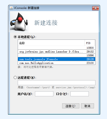 我们打开另一个命令行窗口,输入jconsole启动JavaSE自带的一个JMX客户端程序: