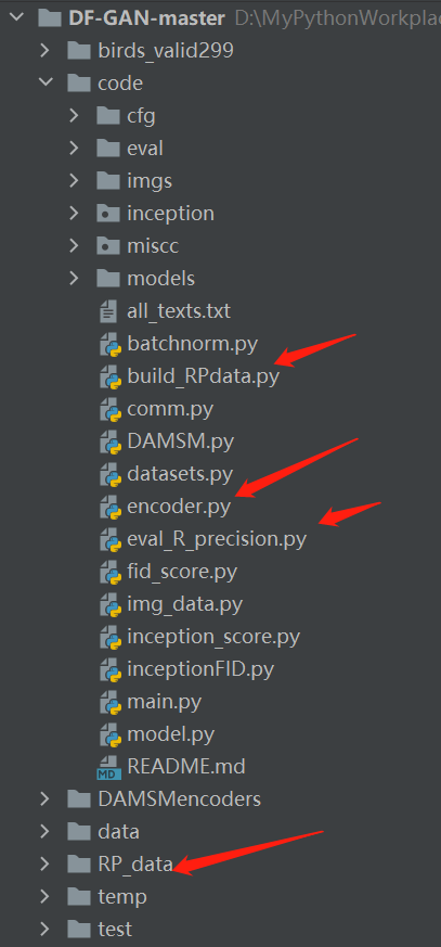 以DF-GAN为例: 将文件放到以上箭头指定的位置(此处只是为了方便这样放,也可以自己单独做文件夹放,只要后面的文件路径你能配好随意放都行)