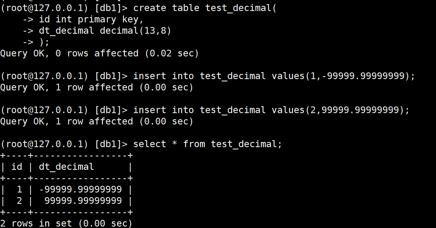 上述表结构中, decimal(13,8) 表示,该字段一共13位(整数个数+小数个数), 小数部分占8位, 那么整数部分就占5位. 能表示的范围就是-99999.99999999