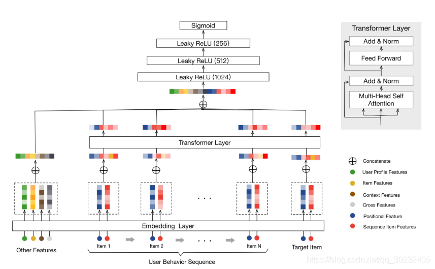 以前点击items和相关的特征被直接嵌入到底层的向量当中。本论文最大的不同在于,BST主要利用了transformer层来学习内在的用户点击信号。