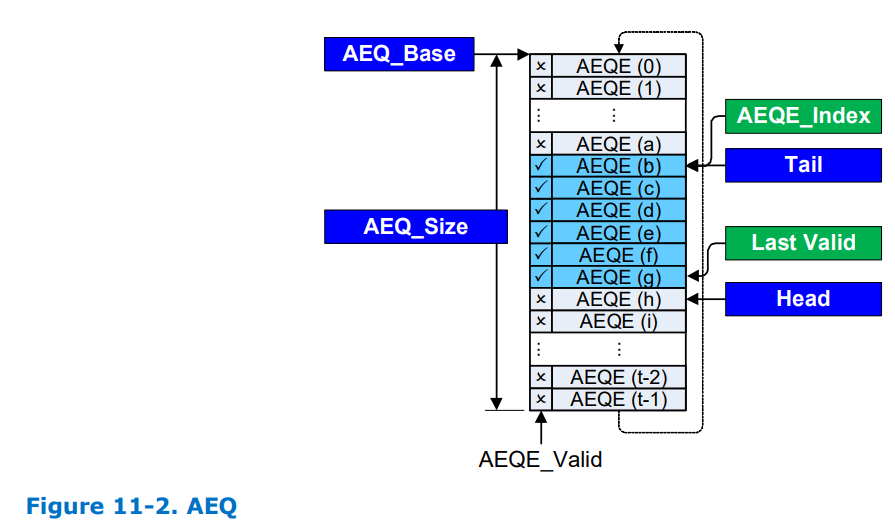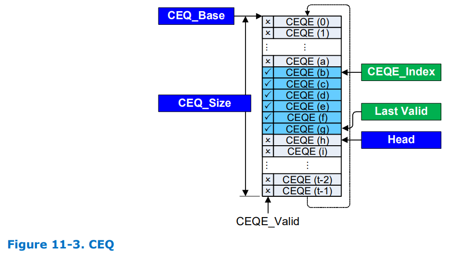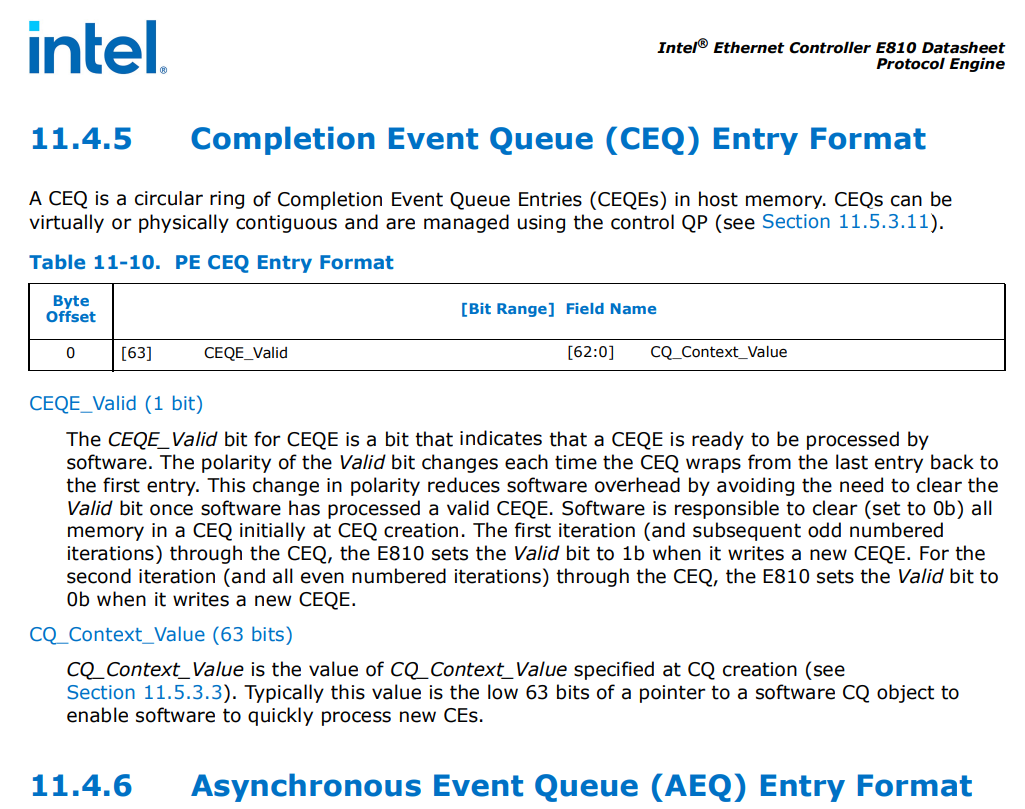 一旦 E810 返回到 CEQE0,CEQE_Valid 位的极性就会切换,以避免软件需要为每个处理的 CEQE 返回并清除 CEQE_Valid 位(用极性位来提高处理效率)。