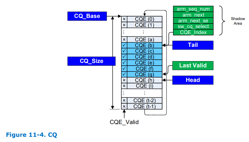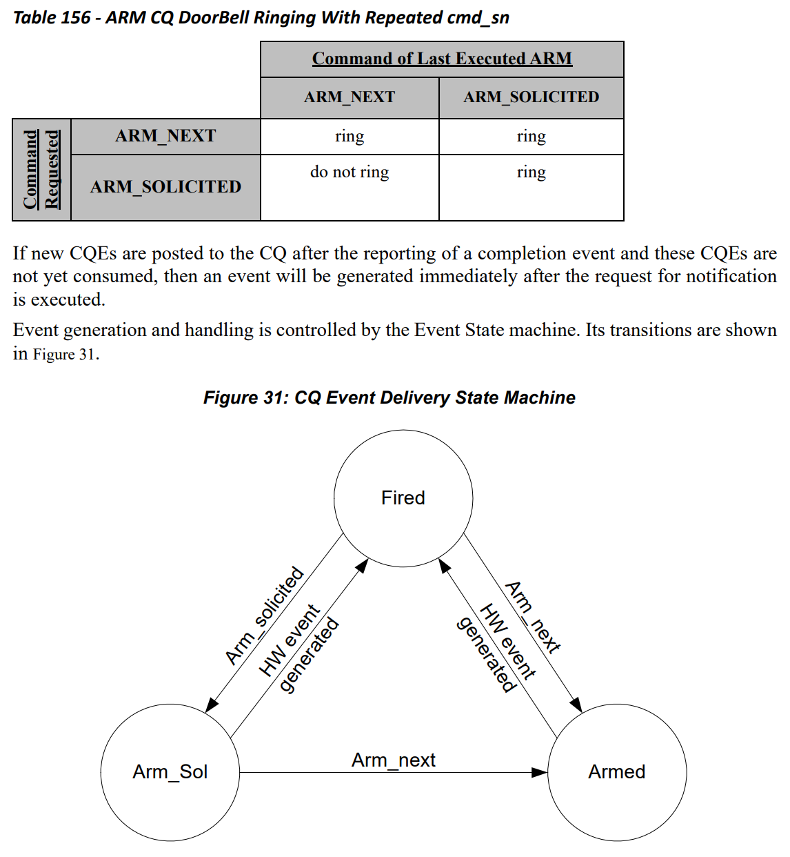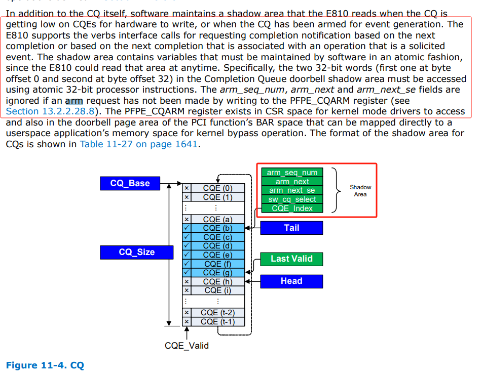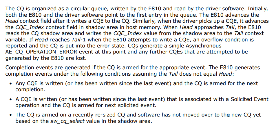 E810 与生成完成事件的动词规范定义在两个方面略有不同。首先,1. 如果此CQ已经通过ARM机制通知硬件产生下一个完成事件且CQE 尚未由软件处理(读取门铃阴影区域后,Head != Tail),E810则不会等待新的CQE, 直接生成一个完成事件。其次,2. E810 不会跟踪自上次完成事件以来生成的请求事件(SE)的确切位置。如果自上次生成完成事件以来已经生成任何请求事件完成(SE),并且似乎 CQE 尚未由软件处理,E810 会为请求事件操作生成完成事件。E810 为事件生成准备 CQ 的过程只是首先写入 CQ 阴影区域中的相应位以启用下一个或下一个请求完成通知事件,增加 arm_seq_num,然后写入 PFPE_CQARM 寄存器(参见第 13.2.2.28.8 节)。然后,E810 读取影子区域,并使用 CQ 上下文立即生成新的完成事件(如果 CQ 有未处理的 CQE 剩余),或者在写入后续 CQE 后启用 CQ 以生成新事件。如前所述,在某些情况下可以推迟完成事件。E810 维护在 CQ 上下文中上次启用请求期间读取的最后一个 arm_seq_num 值的副本。E810 在启用请求期间将 CQ 影子区域中的 arm_seq_num 值与 CQ 上下文中的值进行比较,并删除影子区域和 CQ 上下文中具有相同值的ARM请求。除非应用程序也可以访问 CQ 影子区域,否则此比较可防止恶意应用程序的 CQ 的ARM请求更改 CQ 的ARM状态。