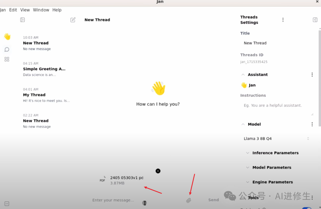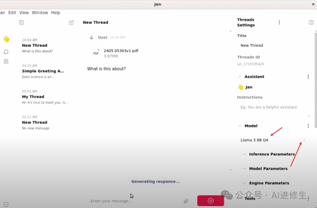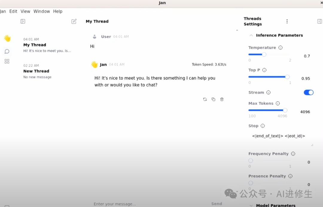 下载完成后,点击“Use”按钮,回到聊天页面,你会看到 Llama 3 模型已选中。发送一条“Hello”消息,模型会初始化并生成响应,非常酷。你还可以重命名对话线程,修改助手的指令,并在这里选择不同的模型。此外,还可以在推理设置中调整模型的高级设置,如温度和最大 tokens。