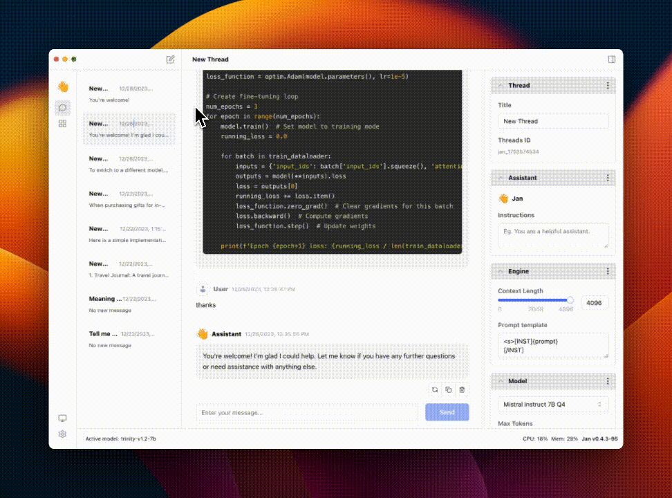 如果你不需要本地模型,Jan 也可以连接到远程模型,如 OpenAI、Gro 或 Mistral API,这样你就不需要高级硬件来访问这些模型的功能。这种灵活性特别有用,当你需要在线模型的能力但仍希望在必要时切换到本地模型。所有对话内容都存储在本地。此外,Jan 跨平台支持 Mac、Linux 和 Windows,极大地提升了可访问性。