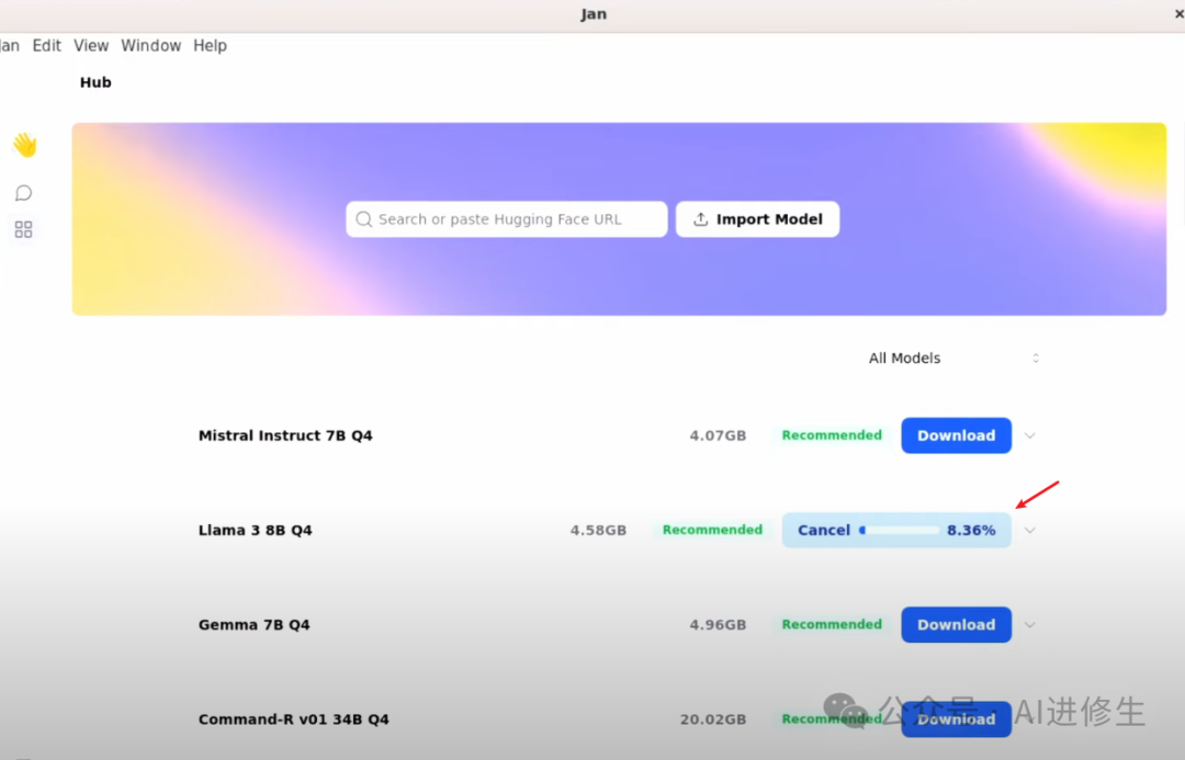 你可能会看到提示没有本地模型,点击“Explore the Hub”选项,你会看到多个模型选项,你还可以粘贴 Hugging Face 链接来自动下载模型。我将安装 Llama 3 模型,只需点击下载按钮即可。
