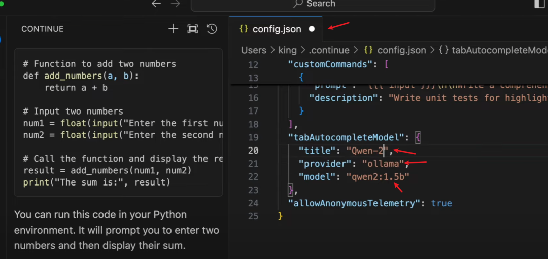 上面修改的是聊天模型,我们还可以修改它的配置文件,将代码补全功能修改为较小的本地模型。