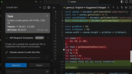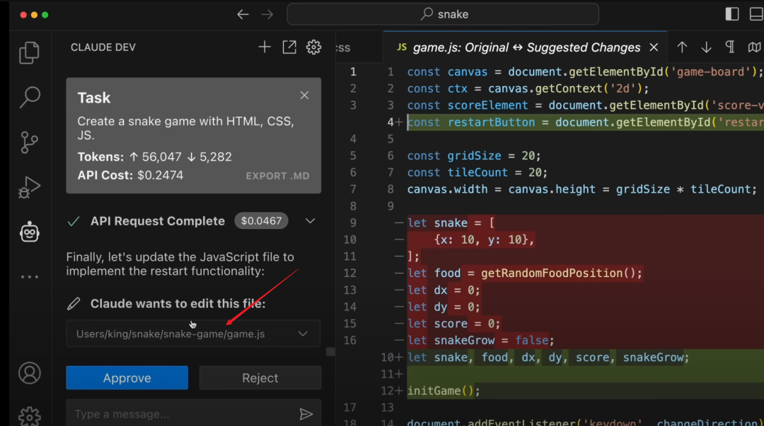 所以我们回到Claude Dev并要求它修复这个问题。我们在这里发送提示,它正在处理,现在它在请求读取game.js文件,我们在这里批准请求。好了,现在正在生成更改,你可以在这里查看代码差异,批准它。好了,完成了。