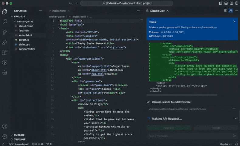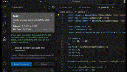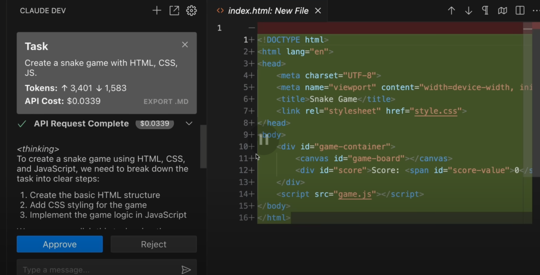 比如生成一个贪吃蛇游戏,它会使用Claude 3.5 Sonnet来生成代码,放到文件中,甚至运行代码,为你提供一个最终运行的应用程序。