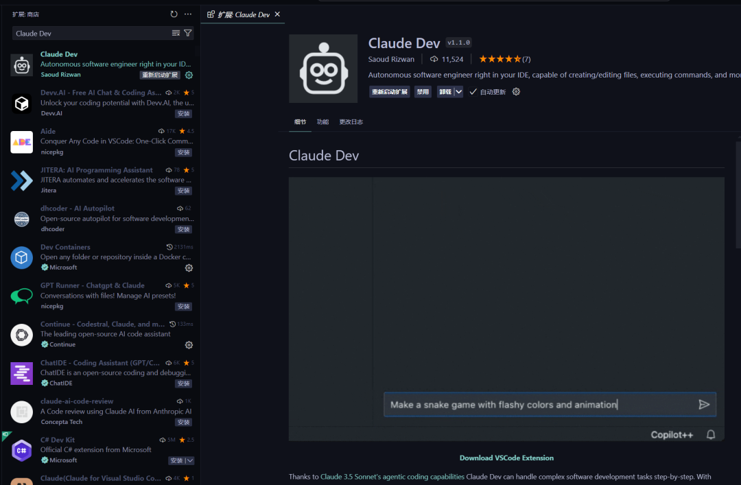 我们只需要打开VS Code,然后搜索Claude Dev,你就会找到这个VS Code扩展。