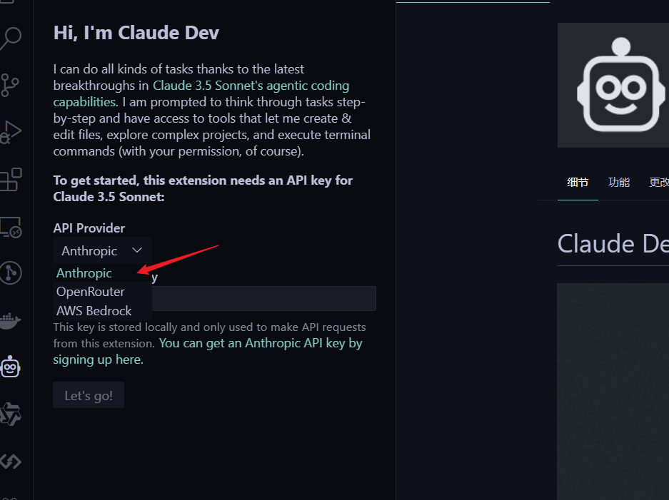 安装好后,你会在侧边栏中看到它,打开它。使用之前,点击设置选项,在这里你需要设置Anthropic的API密钥,