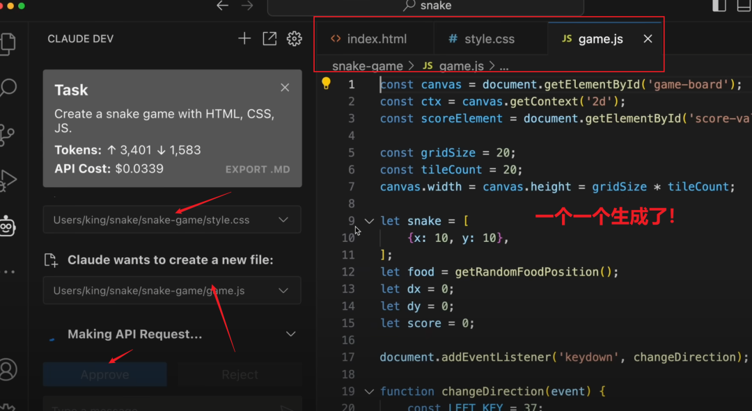接下来它想要编辑style.css文件的代码,我们也批准。然后它想要编辑game.js文件,我们也批准。