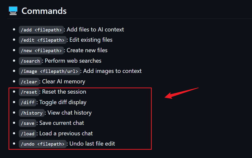 它还有多个命令,就像 aider 的功能一样。可以说它非常受 aider 的启发。它仅使用 Open Router,但我也会告诉你如何使用它与 OpenAI 或 Ollama 配合使用。