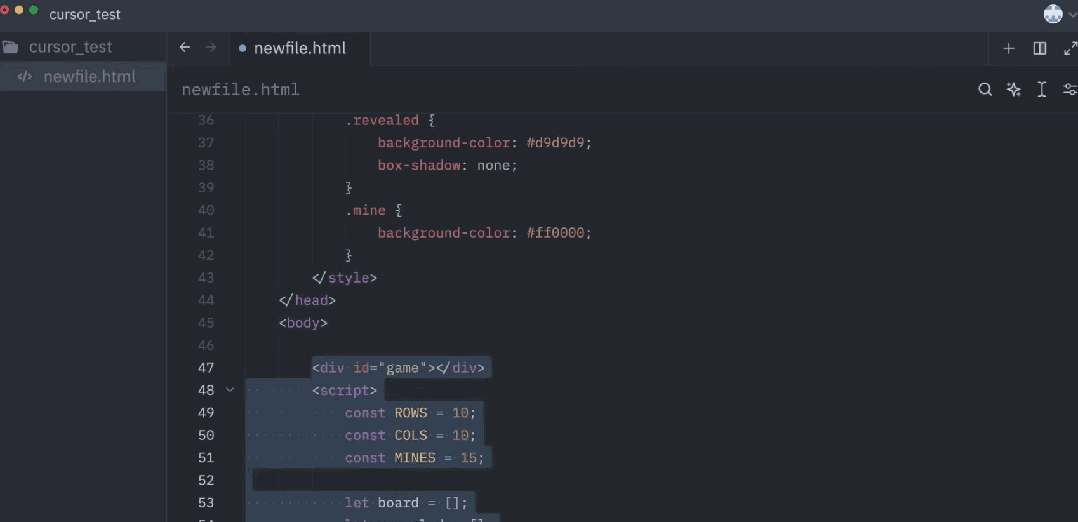 首先我们要求它用 HTML、CSS 和 JS 制作扫雷游戏,发送请求后你会看到它正在生成代码,你可以看到代码在这里被逐行生成,最终完成了。