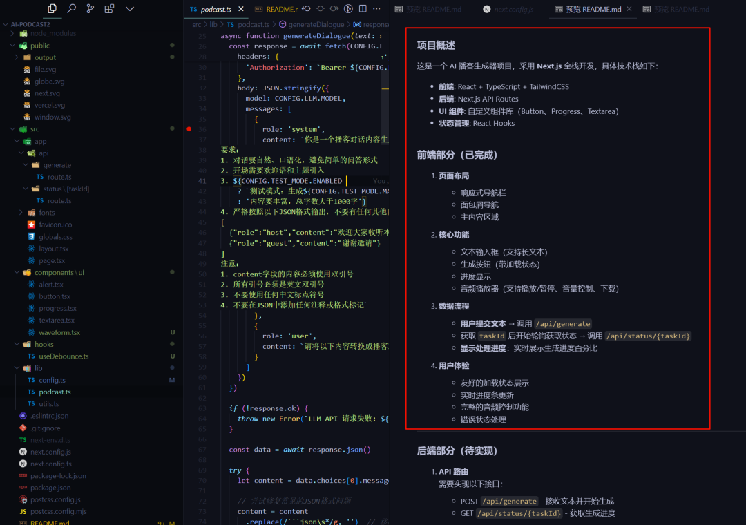 虽然界面呈现是Demo效果,不过我主要想实现的AI播客功能是有了,总得来说可能 我以前低估了AI编程 / 自然语言编程的实力。