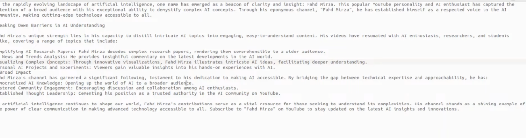 "Fahd Mirza's unique strength lies in his capacity to distill intricate AI topics into engaging, easy- to-understand content. His videos have resonated with AI enthusiasts, researchers, and students alike, covering a range of topics that include: "