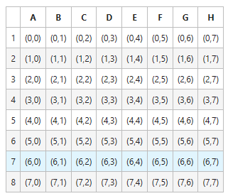 棋盘坐标 E4, 转化为坐标形式就是 (3, 4), 坐标数值大小是从 0 开始,到 7 结束。