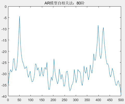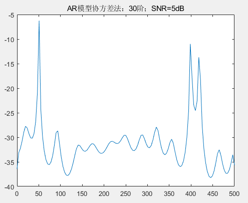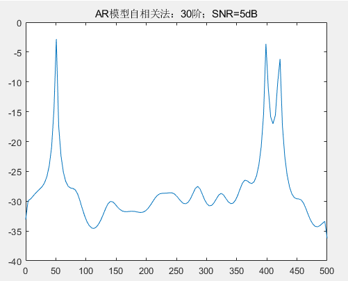 q=30; %MA模型参数直接调用 Matlab 中的 pyulear 函数估计功率谱,设置高斯白噪声信噪比 SNR 为 5。