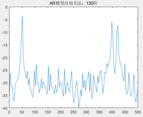 title('AR模型自相关法');分别观察在不同的阶下,自相关法求解 AR 模型功率谱参数,阶次的选取以 步进 8、10、20、30 为选择,分别得到了 AR 模型在 2 阶、10 阶、20 阶、30 阶、60 阶、80 阶、110 阶、130 阶的情况下得到的功率谱参数情况。