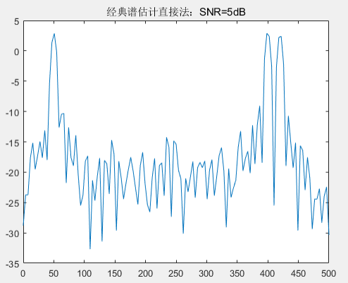采用经典谱估计的直接法和间接法估计功率谱,并对比 30 阶的 AR 模型自相关法和协方差法估计功率谱,初始信噪比 SNR 设置为 5dB,信噪比 SNR 步进幅度为-5dB。