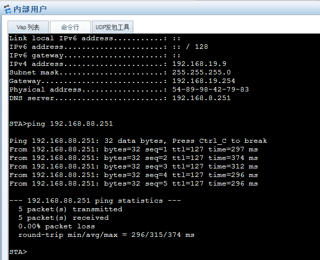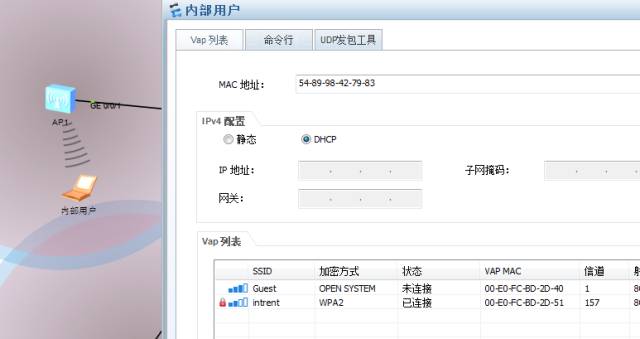 可以看到目前已经连接到内部网络了,我把客户移动,假设漫游的过程。