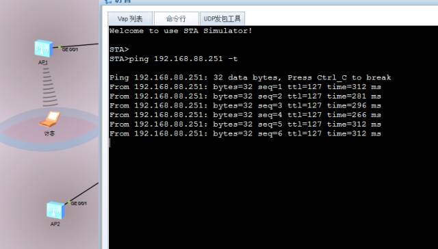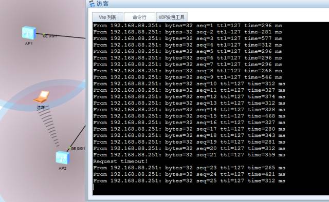 在持续Ping。我们把访客移动到AP 2方向来点,来测试的情况。