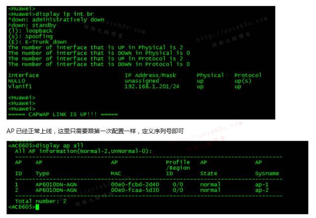 说明:像服务集、安全模板、射频模板都不需要配置了,可以直接应用第一个的。注意这里没给出AP上线的配置,只需要配置一个AP序列号即可。ap id 2 type-id 19 mac 00e0-fcaa-5d30 sn 210235448310C46D0459