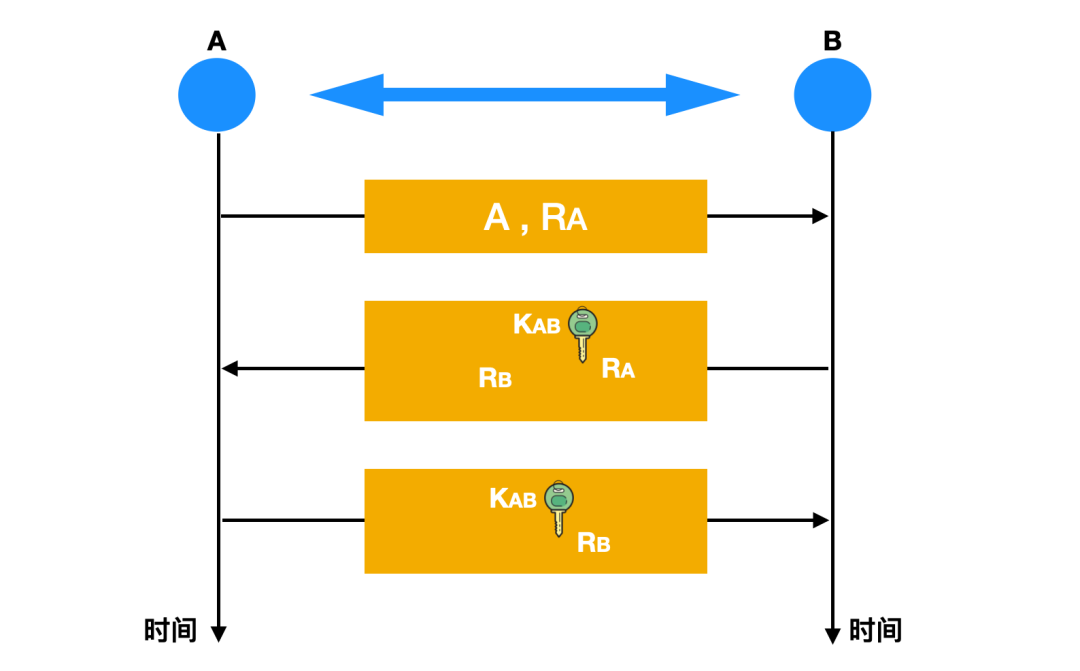 如上图所示,A 首先用明文发送一个自己身份 A 和一个不重数 RA 给接收者 B,B 收到之后会用自己的公钥 KAB 对不重数 RA 进行加密,并生成一个不重数 RB 一起发送给 A,A 收到消息后再用共享密钥对 RB 加密之后再发送给 B 。