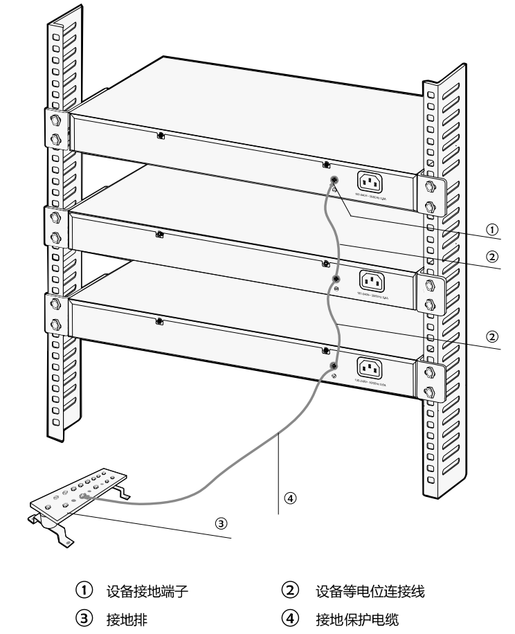 采用上述方式进行设备间等电位连接时,应注意连接导线须采用截面积至少为 6mm2 的铜芯黄绿色 外皮导线,导线长度尽量短,并使用接地排构建一个等电位连接点。