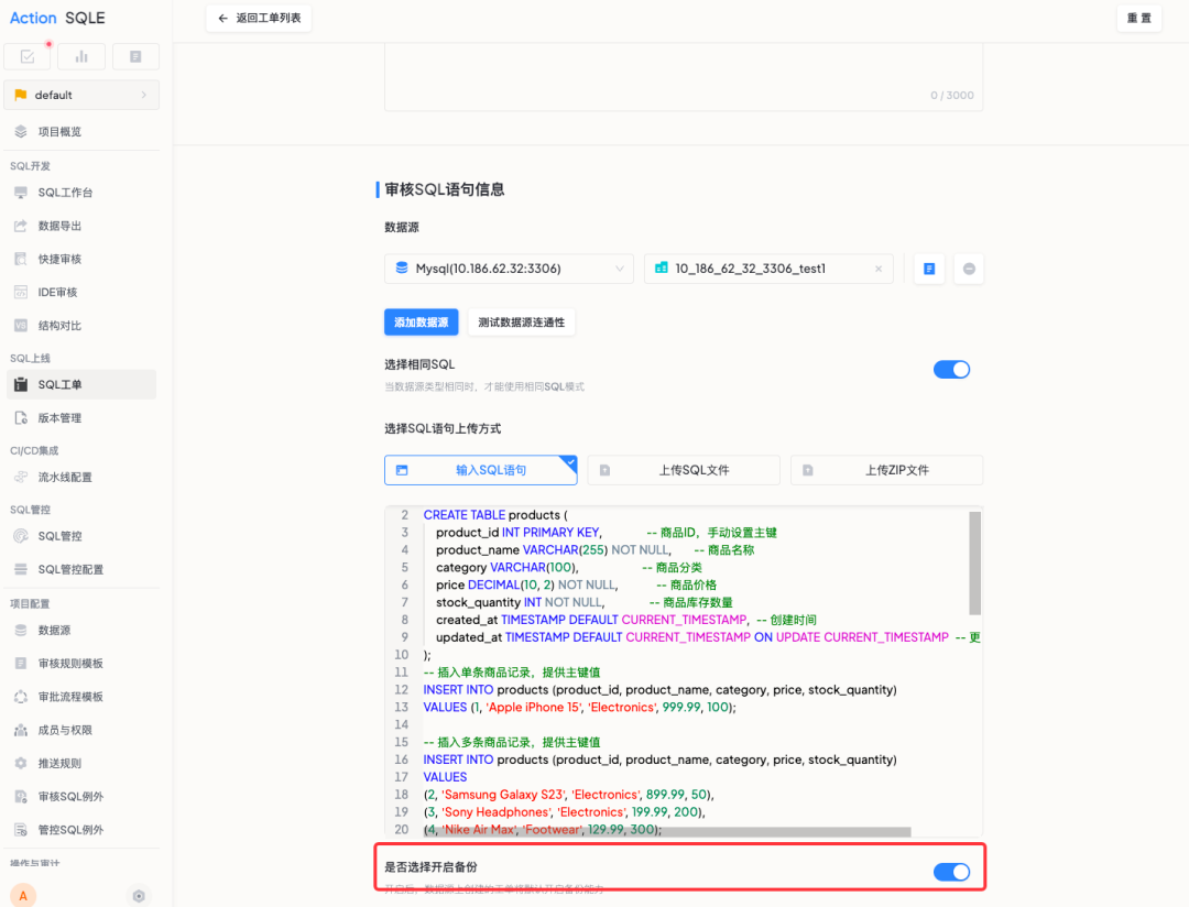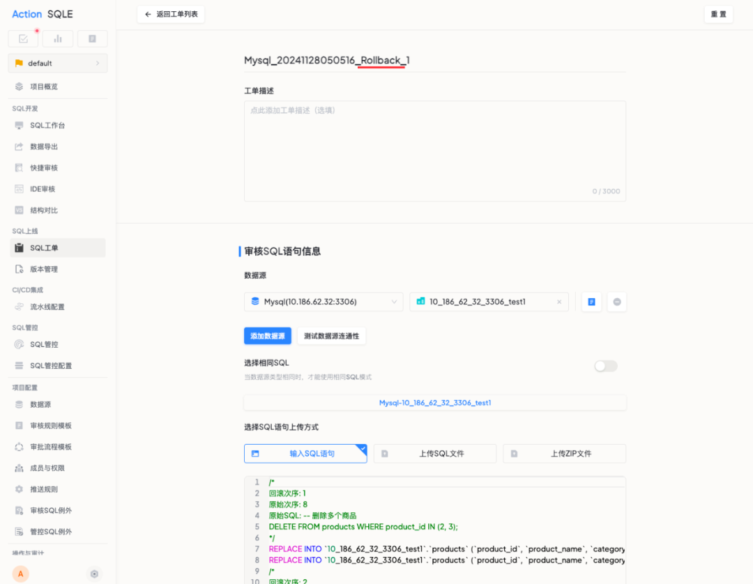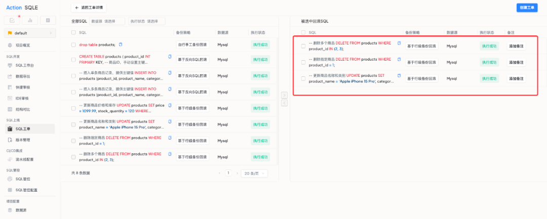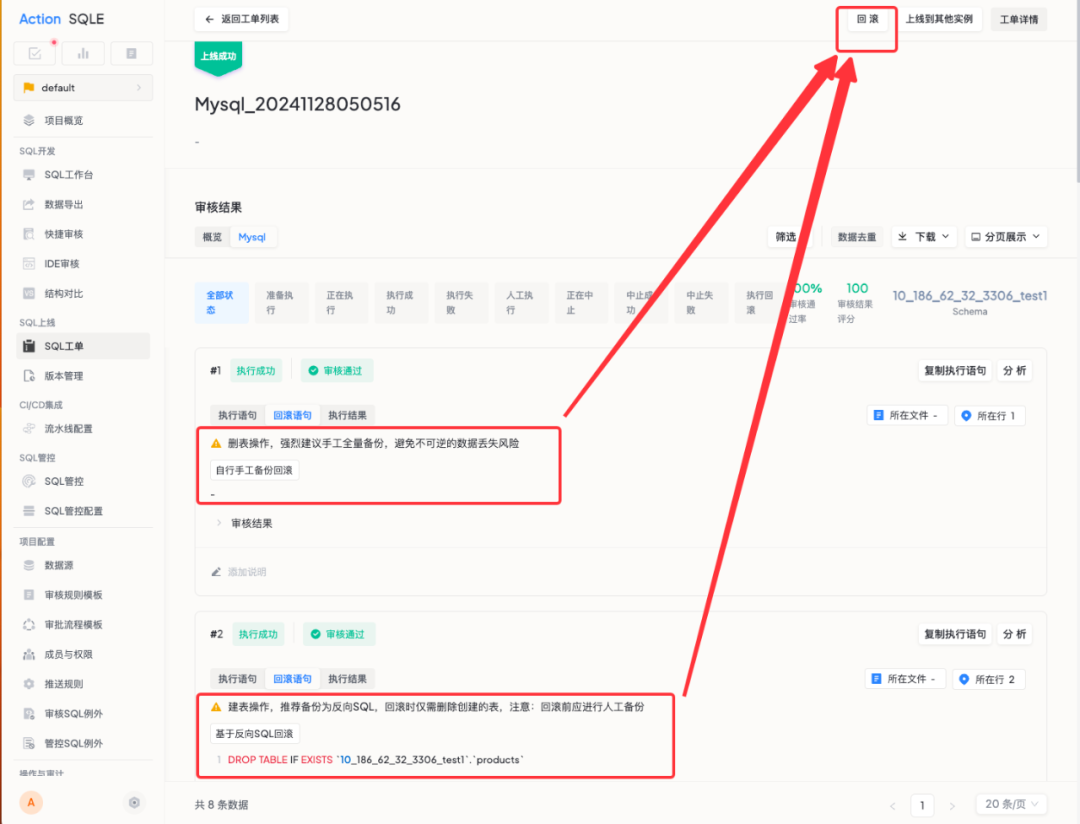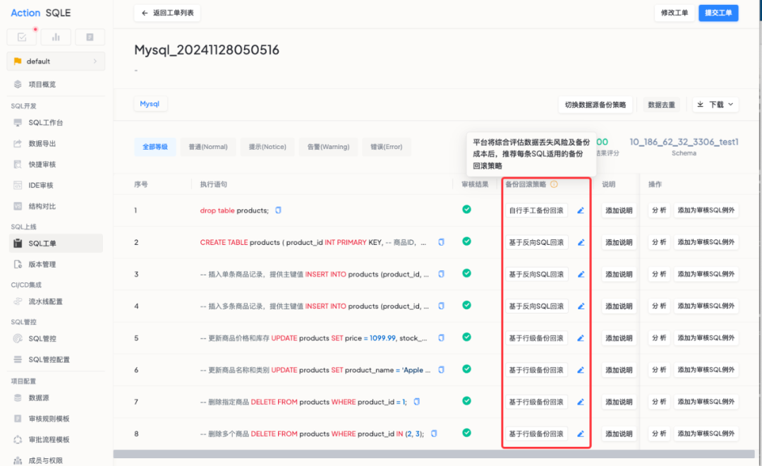 现在,使用者可以利用平台的备份恢复功能,一键回滚变更 SQL,降低故障恢复时间的同时,有效避免人工回滚可能带来的额外风险,让数据库运维更加从容。